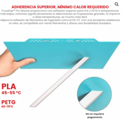 La base de impresión CryoGrip Pro Glacier 250×250 mm está diseñada para brindar alta adherencia sin necesidad de cama caliente. Compatible con impresoras de formato 250×250 mm como Anycubic Kobra 2 Combo, esta placa de acero elástico cuenta con una superficie texturada fina que mejora la fijación de la primera capa incluso a temperatura ambiente. Es ideal para imprimir con PLA, PETG, ABS y filamentos técnicos como PA o PC, siempre que la temperatura del hotend no supere los 300 °C. Su recubrimiento multicapa incluye una capa oleofóbica autorreparable que permite restaurar la adherencia con una simple limpieza con agua o jabón. Su diseño magnético facilita la instalación, y al enfriarse, la flexibilidad del acero permite retirar fácilmente las piezas sin herramientas. Ofrece alta durabilidad, estabilidad térmica y reducción del consumo energético al permitir imprimir sin calentar la cama. Es la opción ideal para usuarios que buscan un flujo de trabajo más eficiente, con menos fallos de impresión, menor mantenimiento y excelente compatibilidad con distintos materiales.
