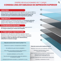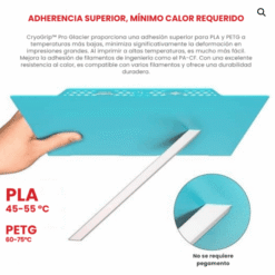 La placa de impresión CryoGrip Pro Glacier de 310×315 mm está diseñada para brindar una experiencia de impresión más eficiente, segura y sin necesidad de cama caliente. Gracias a su superficie texturada fina y recubrimiento multicapa autorreparable, esta base ofrece una excelente adhesión para una amplia gama de filamentos, incluyendo PLA, PETG, TPU, ABS, PA y PC. Compatible con impresoras como Creality K1 Max, Ender-3 V3 Plus y Ender-3 S1 Plus, esta placa permite imprimir incluso a temperatura ambiente, reduciendo significativamente el consumo energético. Su diseño con acero elástico permite una remoción sencilla de las piezas impresas con solo una leve flexión al enfriarse. La superficie CryoGrip Glacier es oleofóbica y resistente al desgaste, manteniéndose limpia y funcional con solo lavados ocasionales con agua o alcohol. La instalación magnética asegura un ajuste rápido y preciso. Ideal para usuarios que imprimen de forma intensiva y buscan una base confiable, fácil de mantener y adaptable a materiales técnicos y convencionales.
