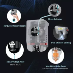 - Eficiencia y Calidad CombinadasVelocidad máxima de 600mm/s, aceleración máxima de 20000mm/s². Menos tiempo de espera: boquilla con un flujo de 32mm³/s, potencia de calefacción de 50w, alcanzando los 200˚C en 35 segundos.